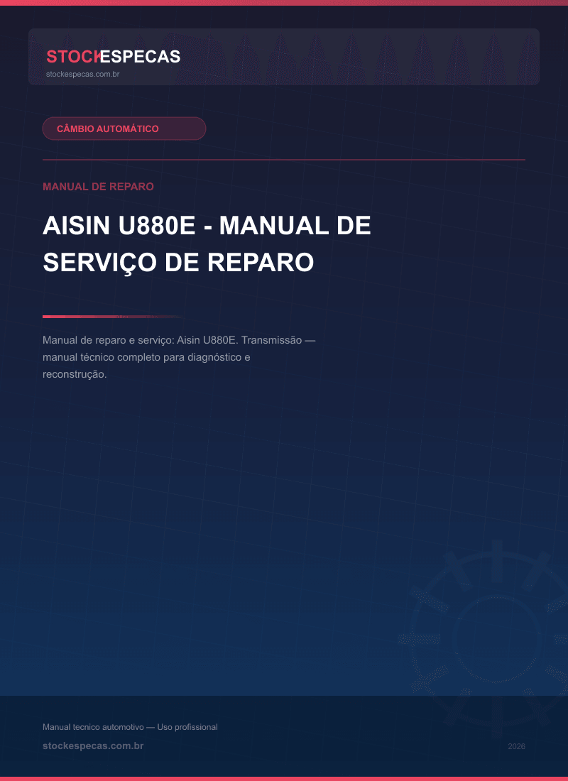 Manual técnico de reparo e manutenção de câmbio automático. Aisin U880E – Manual de serviço de reparo. Este guia abrange procedimentos de diagnóstico, desmontagem, inspeção de componentes e remontagem, incluindo especificações de torque e volumes de fluido ATF.