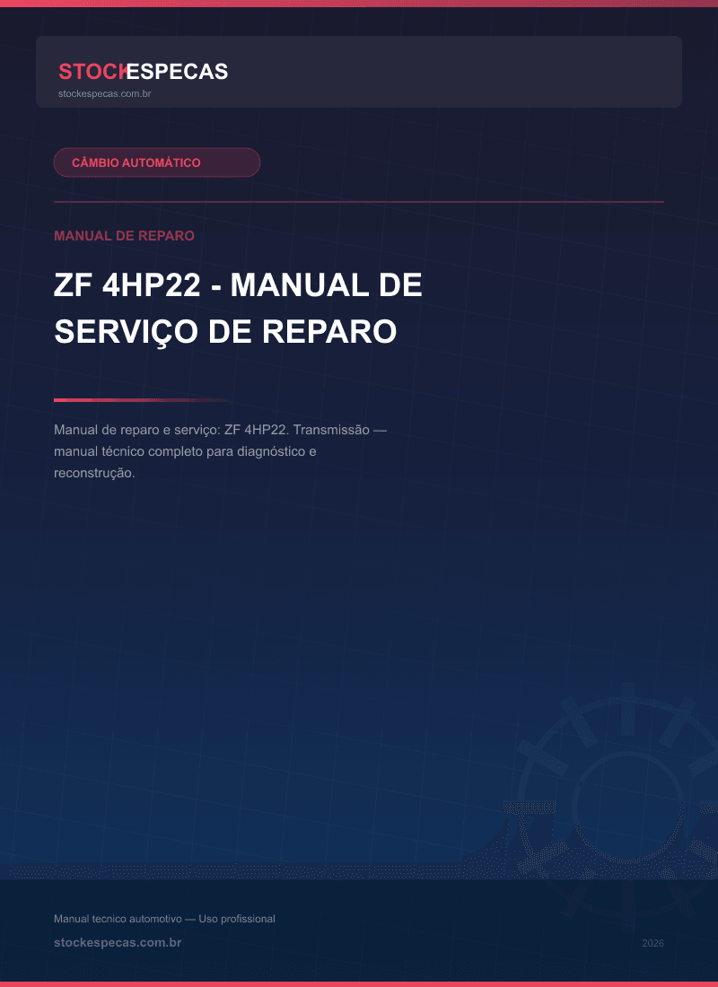 Manual técnico de reparo e manutenção de câmbio automático. ZF 4HP22 – Manual de serviço de reparo. Este guia abrange procedimentos de diagnóstico, desmontagem, inspeção de componentes e remontagem, incluindo especificações de torque e volumes de fluido ATF.