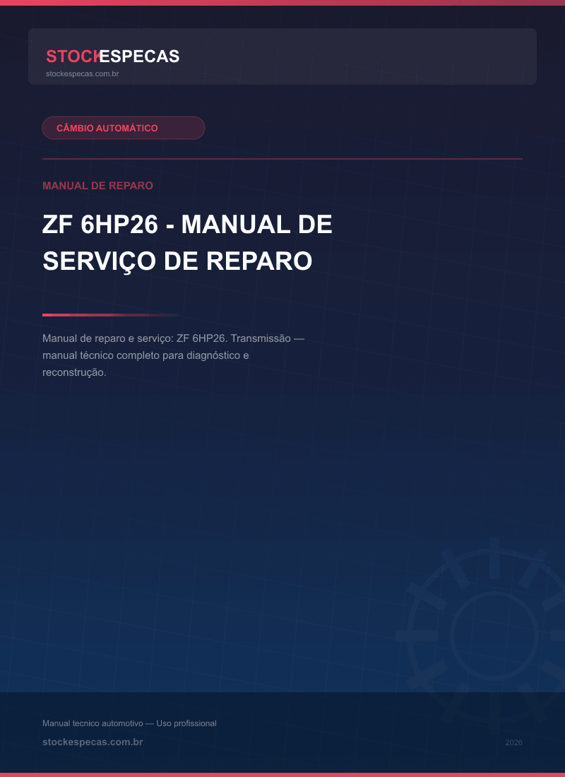 Manual técnico de reparo e manutenção de câmbio automático. ZF 6HP26 – Manual de serviço de reparo. Este guia abrange procedimentos de diagnóstico, desmontagem, inspeção de componentes e remontagem, incluindo especificações de torque e volumes de fluido ATF.