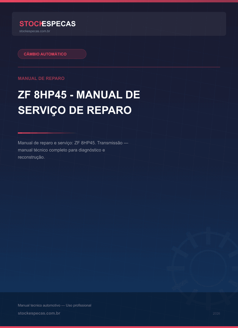 Manual técnico de reparo e manutenção de câmbio automático. ZF 8HP45 – Manual de serviço de reparo. Este guia abrange procedimentos de diagnóstico, desmontagem, inspeção de componentes e remontagem, incluindo especificações de torque e volumes de fluido ATF.