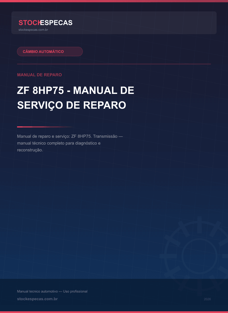 Manual técnico de reparo e manutenção de câmbio automático. ZF 8HP75 – Manual de serviço de reparo. Este guia abrange procedimentos de diagnóstico, desmontagem, inspeção de componentes e remontagem, incluindo especificações de torque e volumes de fluido ATF.