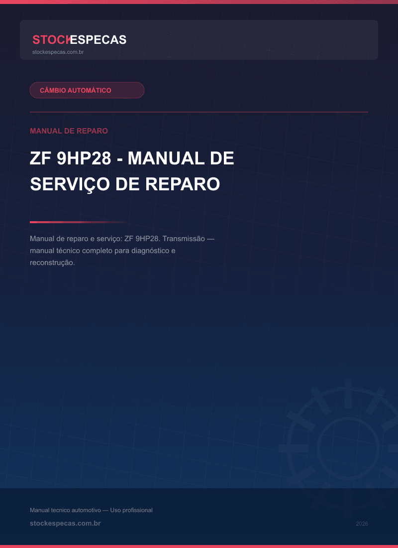 Manual técnico de reparo e manutenção de câmbio automático. ZF 9HP28 – Manual de serviço de reparo. Este guia abrange procedimentos de diagnóstico, desmontagem, inspeção de componentes e remontagem, incluindo especificações de torque e volumes de fluido ATF.
